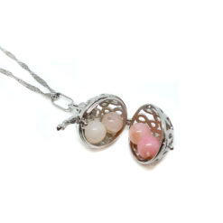 A medál a végtelen motívummal ékesített, belsejében pedig rózsaopál gyöngyök bújnak meg.