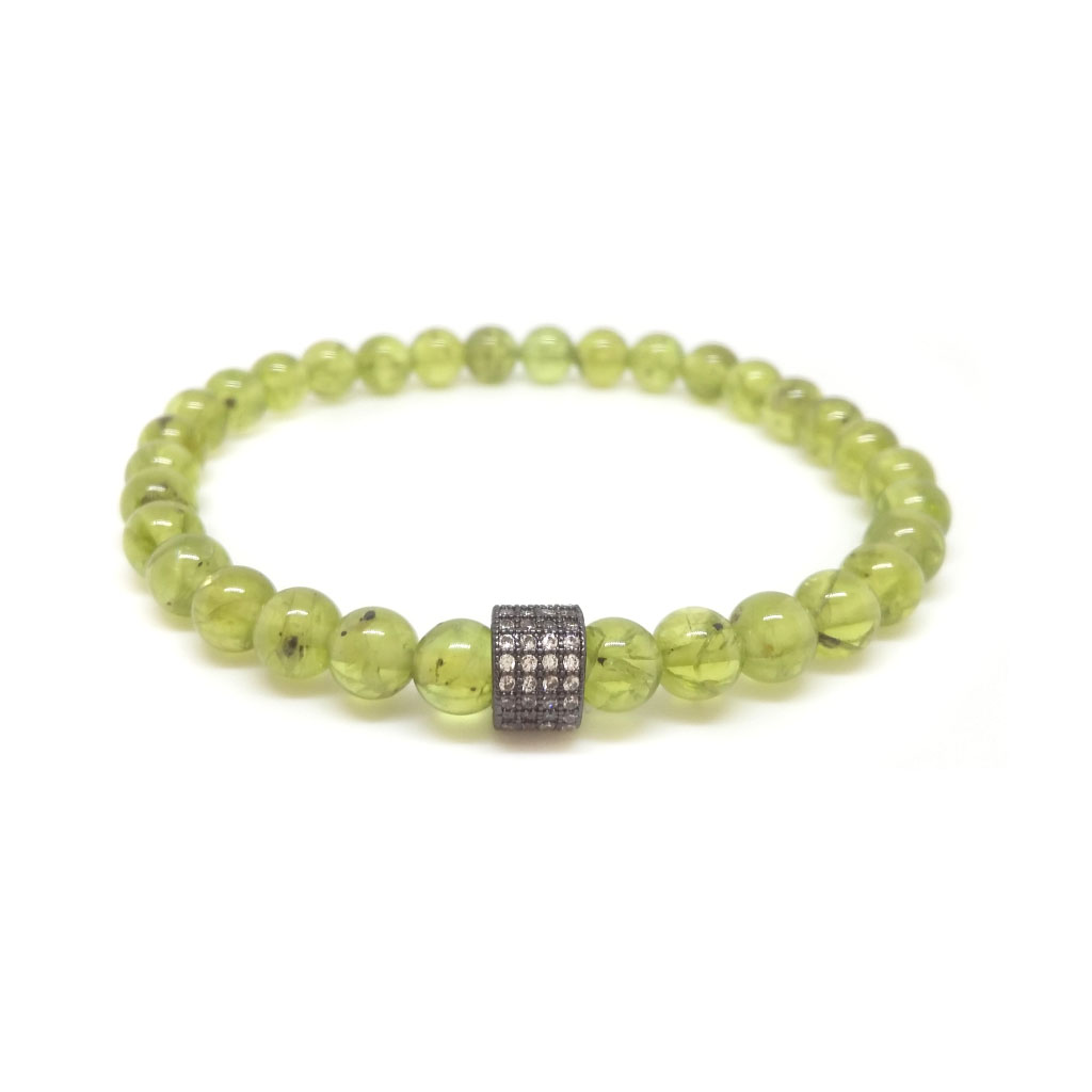 A lélegzetelállító ásvány karkötő 6 mm-es, természetes olivin gyöngyökből készült, melyek különleges, zöldes ragyogásukkal azonnal magukra vonzzák a tekintetet.