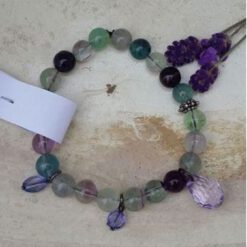 8 mm-es szivárvány flouritból készítettem a karkötőt, melyet ezüst színű köztessel, és különböző méretű és formájú lila gyöngyökkel díszítettem. A szivárvány flourit színvilágát nagyon szépen kiemelik a lilás, lógó díszítőelemek.