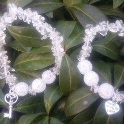 A 5-10 mm-es szemcse hegyikristály karkötőket, 10 mm-es repesztett hegyikristályokkal ékesítettem. A páros karkötők egyikén kulcs, míg a másikán szívecske lógó díszeleg. Az összetartozást jelképezik a karkötők, legyen Anya-lánya vagy legjobb barátnők közös ajándéka.