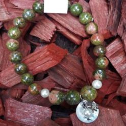 8 és 10 mm-es unakitból készítettem a karkötőt, melyet két tenyésztett gyöngyszemmel és saját készítésű medállal díszítettem. A medál egy kagylókorongból, egy virágból és egy tenyésztett gyöngyszemből áll.