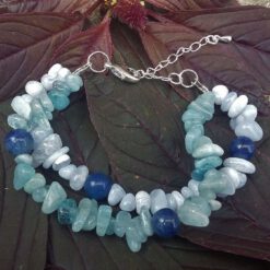 • Gyulladáscsökkentő, véráramlást tisztító, kommunikációt segítő – akvamarin, kalcedon, kék kvarc ásvány karkötő