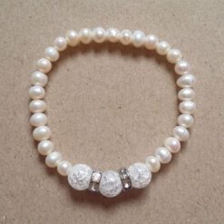 A 6 mm-es gömbölyded édesvízi gyöngyök közé 10 mm-es repesztett hegyikristályokat tettem, mely ásványok szépségét strassz gyűrűvel emeltem ki, a még nőiesebb megjelenésért.