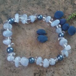 A csiszolt 4-10 mm-es kalcedont és hegyikristályt, egymást váltogatva kombináltam össze. A kétféle ásvány szépségét kiemelik, az elszórt acélkék gyöngyök.
