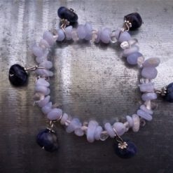 Csiszolt 4-9 mm-es kalcedonból és hegyikristályból készítettem a karkötőt. Az ékszert szabálytalan formájú és méretű szodalit medálokkal díszítettem. A medálokat picike, ezüst színű kalapok ékesítik.