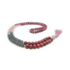 A 108 szemes ásvány mala 8 mm-es sötétebb és világosabb zöld jadeból és holdkőből készült. Guru szemnek, egy 10 mm-es amazonit lett kiválasztva, mely mellett 1-1 szem 4 mm-es fazettált hegyikristály található. Az ásvány gyöngyöket lazán zsinórra fűzték, így könnyen mozdíthatók a szemek számoláskor. A különleges és valódi drágakövekből készült mala jobb érzést és hatást biztosít viselőjének.