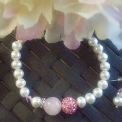 Szabálytalan formájú, kb. 6-7 mm-es tenyésztett gyöngyből készítettem a karkötőt, melyet 10 mm-es rózsakvarccal, hófehér shamballa gyönggyel, világos rózsaszín kristály gyönggyel és apró strassz gyűrűvel díszítettem.